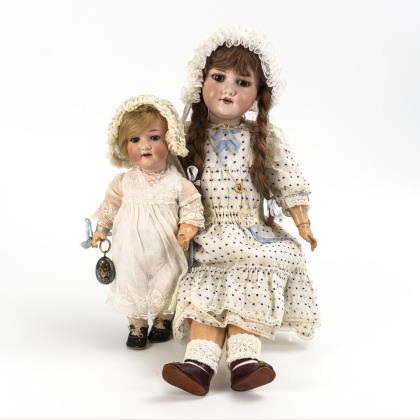 Puppenmädchen (AM 390n) mit Kurbelkopf, braunen Glasaugen, Wimpern, hellbrauner Echthaarperücke mit Zöpfen, 15-teiligem Gliederkörper und weißem Kleid mit blauen Punkten. Kleine Chips an der Halskurbel, linker Fuß mit provisorischer Reparatur, L 63 cm. / Blondes Charakterbaby (Heubach Köppelsdorf 302) mit Kurbelkopf, blauen Schlafaugen, Mohairperücke, 5-teiligem Sitzbabykörper mit Stimme. Weißes Kleid, Haube und schwarze Lackschuhe. Kopf ohne Defekte, Körper mit Übermalungen, L 39 cm