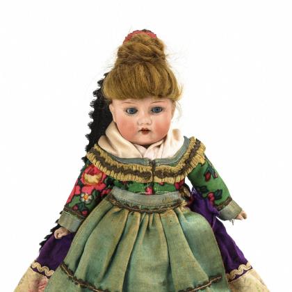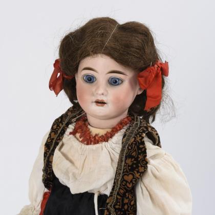 Kurbelkopf, feste blaue Augen, braune Echthaarperücke, 9-teiliger Gliederkörper. Schwarzer Rock, weiße Bluse, Samtweste, Korallenkette und rote Haarschleifen