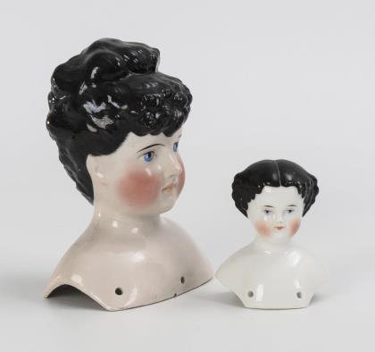 Beide Brustköpfe mit gemalten blauen Augen und modellierten schwarzen Haaren. Großer ausdrucksvoller Kopf wohl Kling, mit Hochsteckfrisur und Schmuckkamm, H 16 cm. Kleiner Kopf mit Mittelscheitel und Locken, H 9 cm
