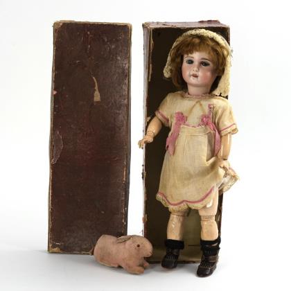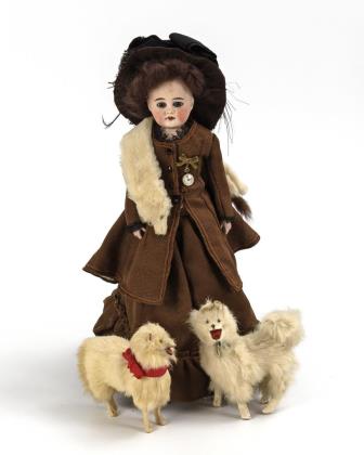 Feste blaue Glasaugen, offener Mund, Ohrlöcher, braune Mohairperücke. Lederkörper mit Zwickeln an Ellbogen, Po und Knien, Unterarme aus Biskuit. Braunes Kostüm, weiße Pelz-Stola, Hut mit Federschmuck, L 39 cm. Dazu 2 Hunde mit weißem Echtfell, H 13/14 cm
