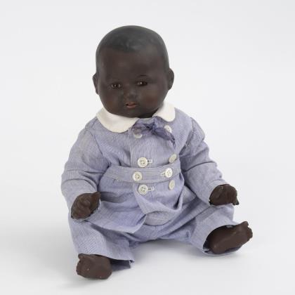 Kurbelkopf, braune Schlaf-/Schelmenaugen, dunkelblonde Mohairperücke. 5-teiliger Sitzbabykörper mit Stimme. Schwarzes Kleid