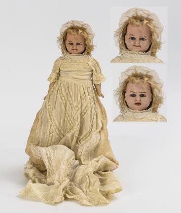 Wachsierter Papiermachékopf, feste blaue Augen, blonde Mohairstirnhaare; mit lachendem und weinendem Gesicht. Stoffkörper mit Massegliedern und intakter Stimme. Altes, langes weißes Kleid, originale Haube