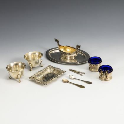Wikingerschiffchen (Sterling, Norway), 4,5 x 8,5 x 3,5 cm. 2 Salieren mit Kobaltglaseinsätzen (Italien), H 2,5 cm. Dazu Versilbertes: Rechteckschälchen, 2 Salieren, Ovaltablett, kleine Zange und 2 Löffelchen