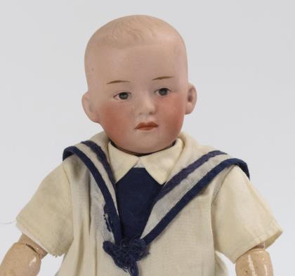 Kurbelkopf, blaue Schlafaugen, offene Nasenlöcher, modellierte Haare. 5-teiliger Sitzbabykörper. Matrosenkleidung mit kurzer Hose