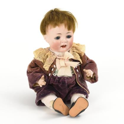 Kurbelkopf, blaue Schlafaugen, bewegliche Zunge, gelb-blonde Mohairperücke. 5-teiliger Sitzbabykörper. Violetter Samtanzug mit Silberfäden, schwarze Wachstuchschuhe