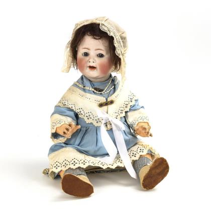 Kurbelkopf, blaue Schlafaugen, Wimpern, blonde Mohairperücke mit kleinen Kahlstellen. Einfacher, 5-teiliger Sitzbabykörper. Blaues Kleid, weißes Jäckchen, braune Lederschuhe, nachgenähte Perlenhaube
