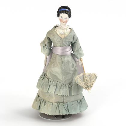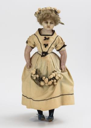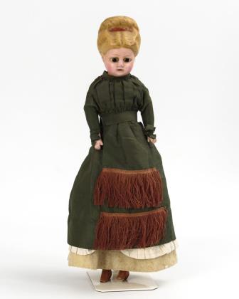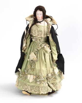 Modellierter Kopf aus Papiermaché, braune Glasaugen, blonde Hochsteckfrisur. Stoffkörper mit Massegliedern. Langes dunkelgrünes Kleid, modellierte Stiefelchen