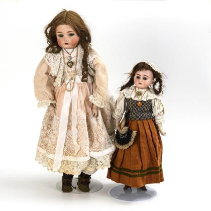 Beide mit getöntem Kurbelkopf, festen braunen Glasaugen, schwarzer Mohairperücke, Pappkörper und Massegliedern. Frau in originalem Kleid (L 38 cm), kleinere Puppe mit gelber Lederkleidung in alter Art (L 27 cm)