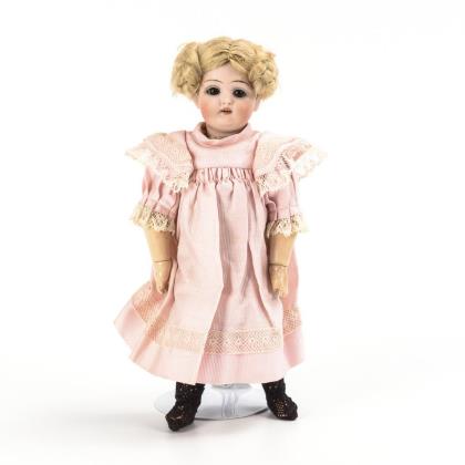 Kurbelkopf, braune Schlafaugen, 1 Ohrring, blonde Mohairperücke. 11-teiliger Gliederkörper. Hellrosa Seidenkleid