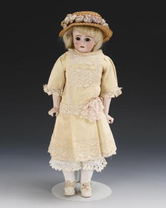 Braune Schlafaugen, blonde Mohairperücke, Stoffkörper mit Biskuitgliedern, cremefarbenes Seidenkleid, Strohhut, weiße Schuhe