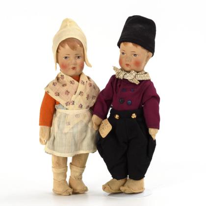 Bemalte Köpfe mit braunen Haaren, Stoffkörper mit gesplinteten Gliedern, originale Kleidung als Mädchen und Junge mit Filzschuhen