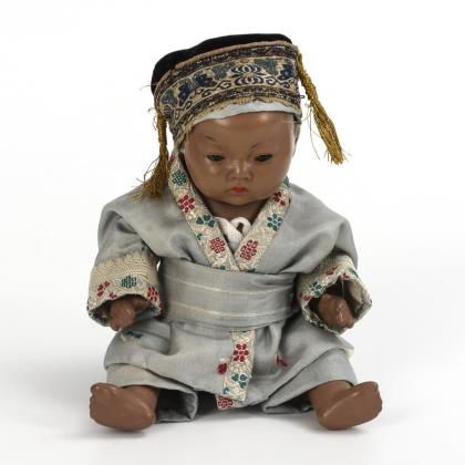 Brustkopf, gemalte blaue Augen, modellierte schwarze Haare, Lederkörper, weiße Biskuitarme. Langes, in alter Art nachgenähtes Kleid, weiße Haube, Perlenkette