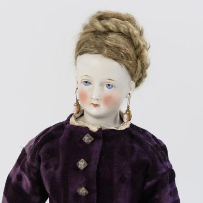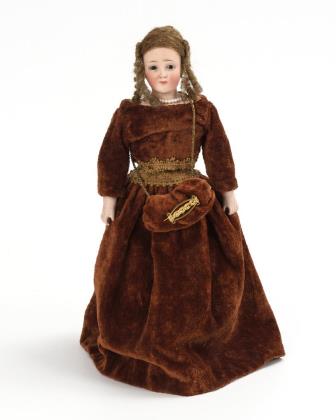 Kurbelkopf, braune Schlafaugen, Ohrringe, braune Echthaarperücke. 11-teiliger Gliederkörper. Purpurfarbenes Seidenkleid, jüngere helle Lederstiefelchen