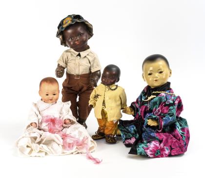 Alle mit Kurbelkopf, Schlafaugen, getöntem Haarboden und 5-teiligem Massekörper. 2x schwarz, 1x hell, 1x asiatisch. Alle bekleidet