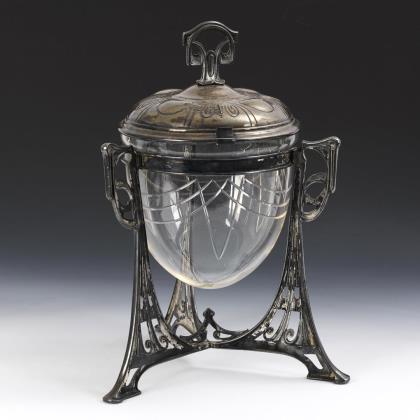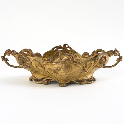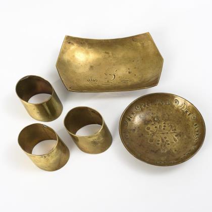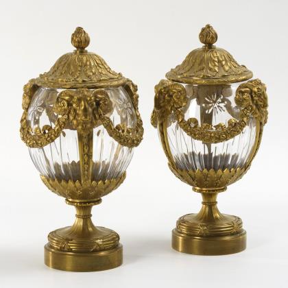 Facettiert geschliffene, schalenartige Glasvase mit feinen Friesen an der antikisierender Messing-Montierung. / Massiver Handleuchter mit Tragegriff und spätbarocker Reliefzier. / Würfelförmiges Tintenfass mit feinen Blattfriesen und Reliefappliken auf jeder Seite: 2x ein Engelspaar, die Kaiserkrone über dem Postament mit Napoleon-Monogramm haltend bzw. 2x ein Hippokamp. Auf dem Scharnierdeckel ein applizierter Eichen-Lorbeer-Kranz, darunter ein Glasnapf. / Tintenfass mit rundem Marmor-Sockel und verzierten Bronzegefäß mit Scharnierdeckel, darunter ein Glasnapf