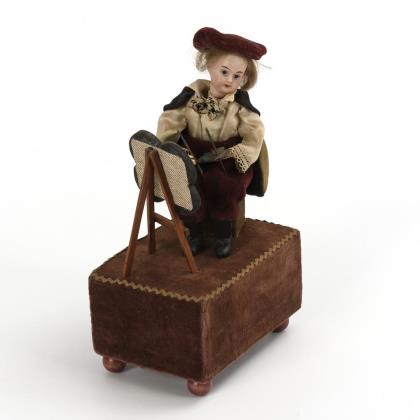 Porzellankopfpuppe in Kleidung eines Malers mit Staffelei. Auf Podest mit braunem Samtbezug und Spielwerk. Spielt Musik, bewegt dabei Kopf und Hände. Intaktes Werk mit festem Schlüssel