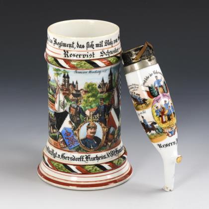Reservistenkrug mit Bildnis Friedrichs II., Stadtansicht, Soldatenszenen und Sinnsprüchen. "Reservist Schuster, 11. Comp. Füs.Rgt. v. Gersdorff Kurhess. No. 80 Homburg 1907-09" sowie gedruckte Namensliste. Lithophanie: Abschied des Soldaten. / Pfeifenstummel mit Tschakkodeckel, soldatischen Szenen und Sprüchen "Reservist Mank, 5. Escadr. 1. Hess. Husaren Regiment König Humbert von Italien Nr. 13 Bockenheim, 1895/98" mit gemalter Namensliste sowie Signatur "E. Bögelmann Colmar"