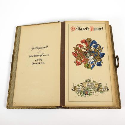 Wappen und Zirkel der Turnerschaft Salia-Jenensis zu Göttingen. 107 Porträt-Fotografien, darunter 23 Studenten und 2 Uniformierte zumeist cdv, einige mit Widmungen. Gefertigt von Fotostudios in Jena, z.B. Friedrich Haack, Bräunlich & Tesch usw