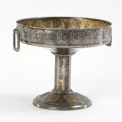 Tafelaufsatz mit geprägten Rosetten am Fuß und an der Wandung sowie 2 Handhaben. Am Fuß Widmung: "Seinem verdienten Speiseanstaltsverwalter zur silbernen Hochzeit das Offiziers-Korps k. 3. Feldart.-Rgts. Prinz Leopold"