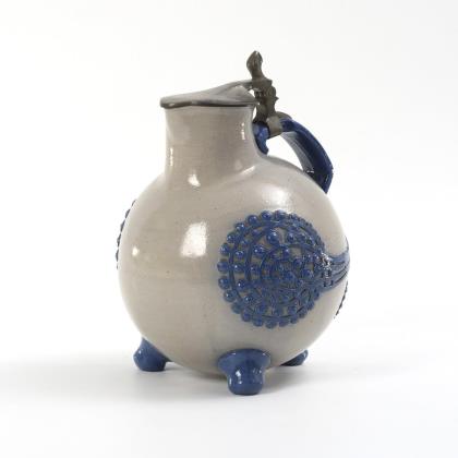 Im Stil barocker Krüge gefertigter, kobaltblau glasierter Kugelbauchkrug mit Enghals und stark hochgezogenem Bandhenkel, schauseitig das aufgelegte, teils kalt bemalte sächsische Wappen. Dazu der Ausstellungskatalog Richter, Rainer: Kurt Feuerriegel 1880-1961, Katalog zur Ausstellung in Schloß Pillnitz vom 6. Juni bis 31. Oktober 1992, Staatliche Kunstsammlungen Dresden, Kunstgewerbemuseum