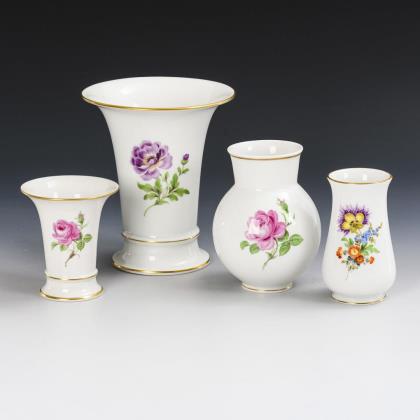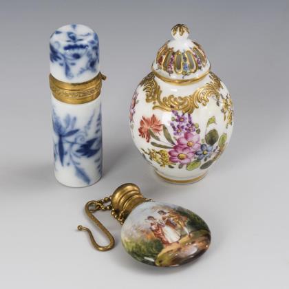Potpourriväschen mit Blumen- und Goldreliefmalerei (H 8 cm). / Zwiebelmuster-Zylinderflakon mit metallmontiertem Scharnierdeckel (L 8 cm). / Miniaturplattflasche mit Watteau-Motiv und metallmontiertem Scharnierdeckel (H 5,7 cm)