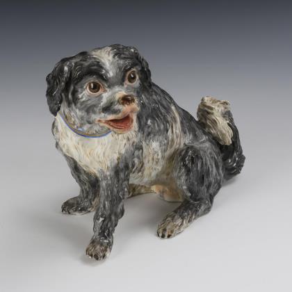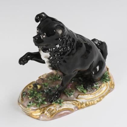 Länglicher, reich blütenbelegter Sockel mit der Plastik eines liegenden Mopses