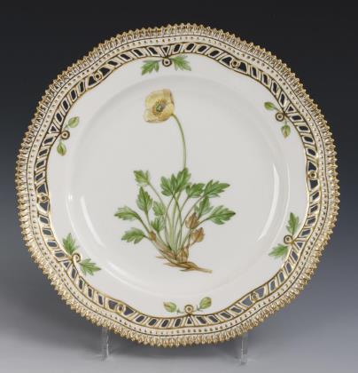 Teller mit gezacktem und stabdurchbrochenem Rand. Im Spiegel die Darstellung des Island-Mohns, unterseitig lateinisch bezeichnet