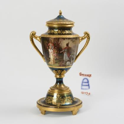 Ovoider Korpus, zwei Henkel, Knaufdeckel, Rundfuß, auf hutförmigem großen Rundsockel. Umalufend bemalt mit einer romantischen Landschaft, mit der schauseitigen Darstellung des aus dem Schwanenboot entsteigenden, Elsa von Brabant die Hand reichenden Lohengrin; dunkelgrüner, irisierter Teilfond mit reicher Reliefgoldmalerei