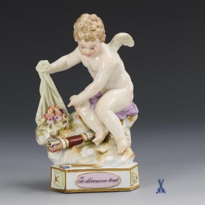 Auf einem Steinsockel sitzender, auf zwei Herzen in Rosen zeigender Putto, auf dem dreiseitigen Sockel die Devise "Je découvre tout."
