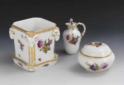 1x quadratischer Blumenübertopf (H 13,5 cm) mit vier Widderköpfen und Untersetzer (14 x 14 cm). / 1x Balusterkännchen mit dem Reliefdekor "Neuozier" und Rosenknaufdeckel (H 13,5 cm). / 1x gedrückt gebauchte Zuckerdose (H 9 cm)