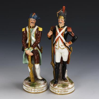 1x Porzellan, 1x Keramik. Je ein Rokokomädchen im goldenen Kleid an einer gerippten Vase mit durchbrochenem Rand stehend