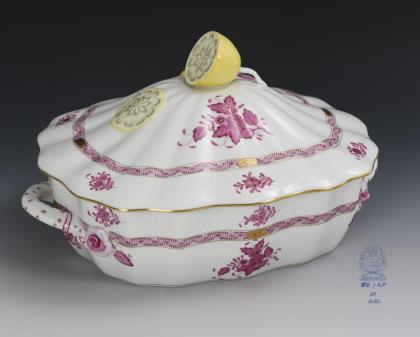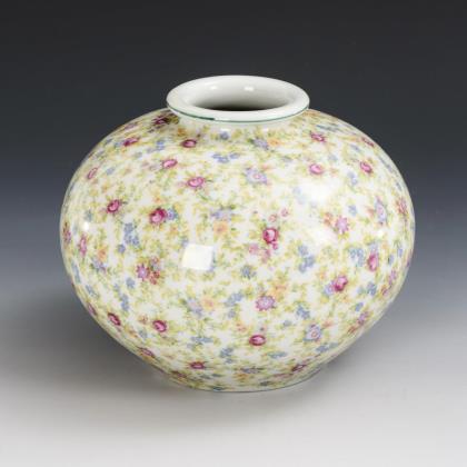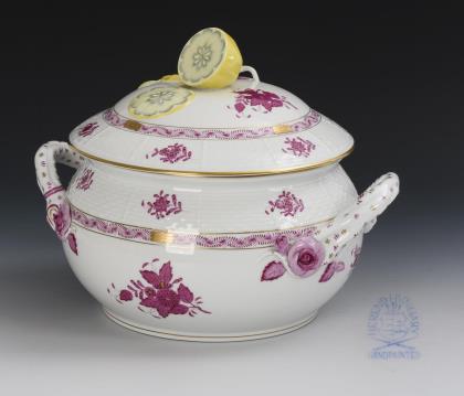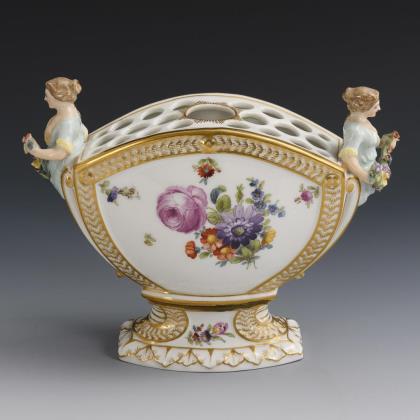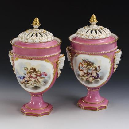Halbovoider Korpus mit zwei Biskuitmaskaronhandhaben, durchbrochenem Knaufdeckel und Rundfuß, auf Quadratplinthe. Rosa Fond, schauseitig ein goldgerahmtes Medaillon mit der Darstellung zweier Putten auf einer Wolke, verso Blumenmalerei