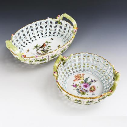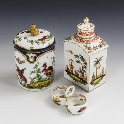 1x Ankermarke: Zylinderdose mit Vogelmalerei und metallmontiertem Deckelrand (Metallmontierung des Dosenrandes fehlt; H 16 cm). / 1x bezeichnet "Pannel et Chapelle": rechteckige Dose mit Knaufdeckel und Chinoiseriemalerei (H 17,5 cm). / 1x Helena Wolfsohn: Gewürzschälchen mt Vogelmalerei (L 9 cm)
