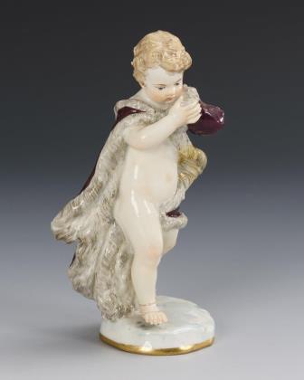 Auf einem Natursockel stehender Putto mit pelzgefüttertem Umhang und Schlittschuhen