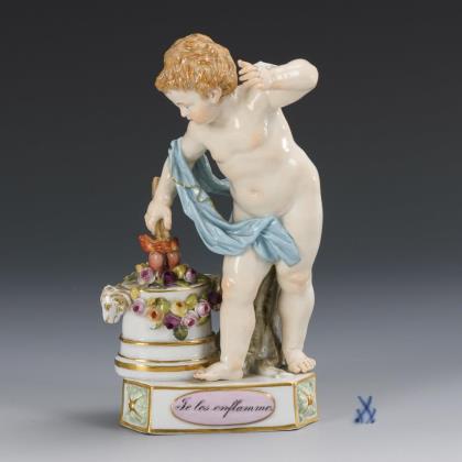 An einer Widderkopfschale mit Rosen und flammenden Herzen stehender Amorknabe mit Fackel, auf dem dreiseitigen Sockel die Aufschrift "Je les enflammé."