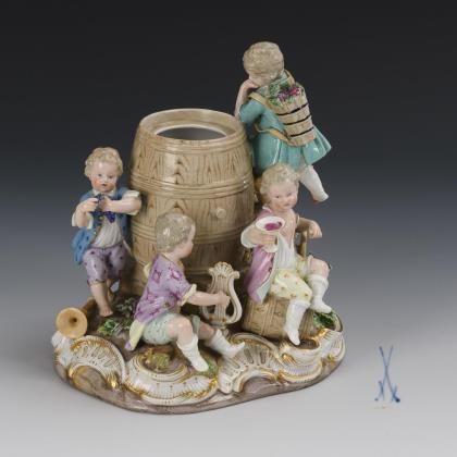Gruppe von fünf Putten mit Weinbütte, Lyra, Weinschale und Weinbecher an einem Weinfass