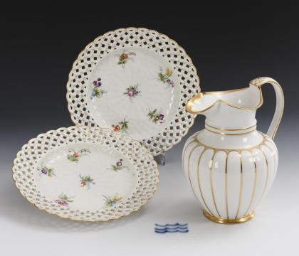 1x gerade godronierte Wasserkanne mit Knaufdeckel (H 23,5 cm). / 2 Durchbruchteller mit Blumenmalerei (Ø 25,5 cm)