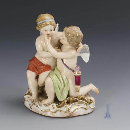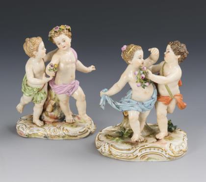 1x tanzende Putten, Modell-Nr. 2996 (H 11 cm). / 1x Puttengruppe mit Rosenstrauß, Modell-Nr. 2990 (H 11,5 cm)