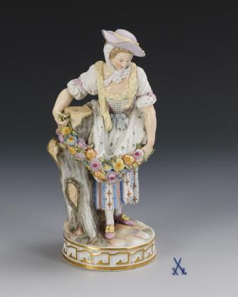 An einer Vase mit Rosen stehende, ein Blumensträußchen haltende Flora