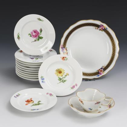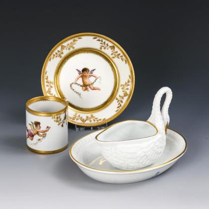 1x Potschappel: kleine weiße Sauciere in Form eines Schwanes (H 9 cm), originale Untertasse (L 15,5 cm). / 1x Neapelmarke: Zylindertasse (H 5,5 cm) mit der polychromen Darstellung eines schwebenden Putten mit Blüten bzw. Blütengirlande, originale Untertasse (Ø 12,5 cm)