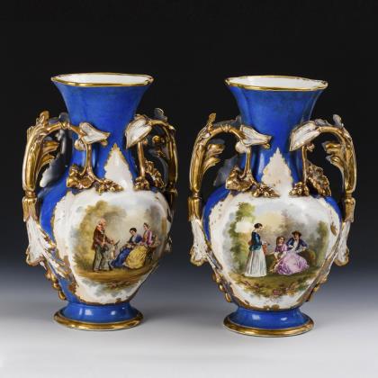 Balustervasen mit zwei floralen Henkeln. Blauer Fond, schauseitig je eine große Kartusche mit der Darstellung einer kleinen Gesellschaft in einer Parklandschaft bzw. eines Jägers mit zwei Damen