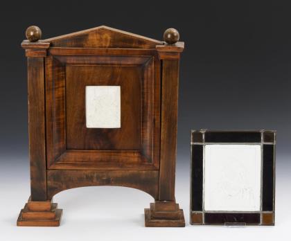 1x in Form eines Portales gestalteter Holzrahmen mit einer kleinen, eingesetzten Lithophanie mit der Darstellung eines schaukelnden Paares (Lithophanie 9 x 7,5 cm; Rahmen 39,5 x 32,5 cm). / 1x Lithophanie mit der Darstellung eines Mädchens mit Katze, eingefasst in einen Bleiglasrahmen (18,5 x 16,5 cm), mit Messingaufsteller (H 18 cm)