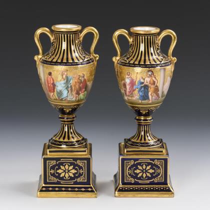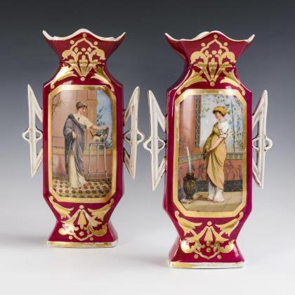 Rechteckige Vasen mit dreieckig-spitzen Henkeln, passigem Rand und konischem Fuß. Purpurfarbener Fond mit ornamentaler Goldmalerei, schauseitig jeweils eine große Rechteckkartusche mit der Darstellung einer Dame mit Katze bzw. einer jungen Frau am Brunnen, verso Blumenmalerei