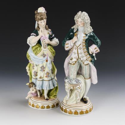 1x Figur eines sich auf einen Hocker knienden Rokokokavaliers mit Stab. / 1x Rokokodame mit Amorknaben zu ihren Füßen