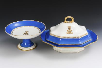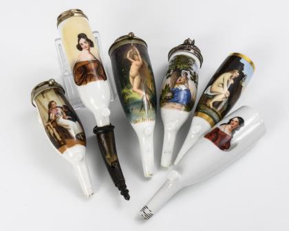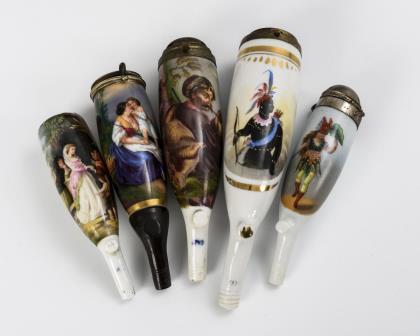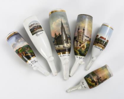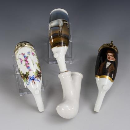 2x Meissen: 1x mit Metallmontierung und dem aus einer Rosen- und Vergißmeinnichtgirlande geformten Buchstaben "V" zwischen Eichenzweigen (L 11,5 cm) und 1x mit Metallmontierung, einem Herrenporträt und der Bezeichnung "Meinem vielgeliebten Bruder Julius zum 20ten Wiegenfeste, d. 02. Juli 1835" (L 13 cm). / 1x mit Saftsack und der über Vordruck gemalten Darstellung eines Schimmels (L 19 cm)