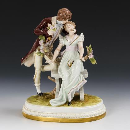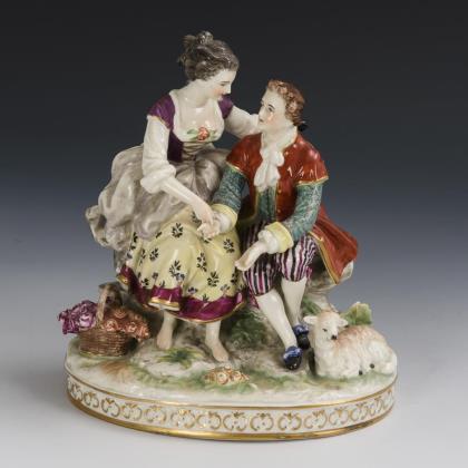 Auf einem Felssockel sitzendes Schäferpaar mit Lamm und Rosenkorb