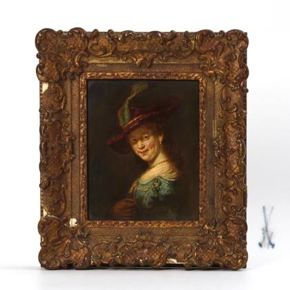 Rechteckige Platte mit der Darstellung der Saskia von Uylenburgh (1612-1646), der Frau des Malers Rembrand van Rijn (1606-1669), nach einem Gemälde von Rembrandt van Rijn von 1633