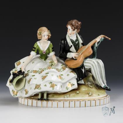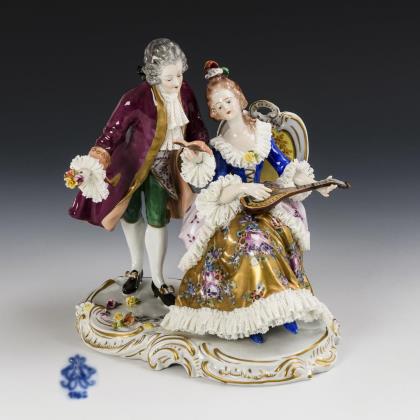 Auf einem Stuhl sitzende, eine Mandoline spielende Rokokodame mit spitzenbesetztem Kleid, zu ihrer Rechten ein Kavalier mit Blumenstrauß und Notenbuch stehend