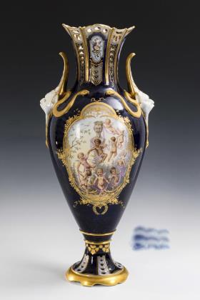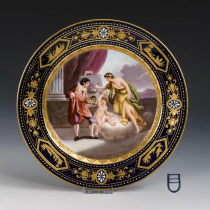 Kobaltblaue Fahne mit Reliefgold- und Weißemailmalerei sowie weißer Juwelenmalerei, im Spiegel die Darstellung einer dreifigurigen Szene mit Maler, Putto mit Blumenkranz und einem auf einer Wolke knienden, an der Staffelei malenden Jüngling
