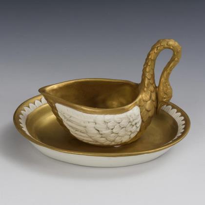 Zylindertässchen mit Ohrenhenkel. Schauseitig auf der Tasse die Darstellung eines Pfaus mit Henne sowie im Spiegel der Untertasse die Darstellung eines exotischen Fasanenpaares